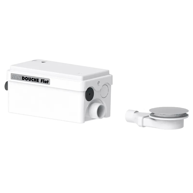 La SFA Sanishower Flat es una solución completa para instalar una ducha o cuarto de baño sin necesidad de bajante cercana ni obras complejas. Este conjunto incluye una bomba de aguas grises compacta y un sifón extraplano de solo 5 cm, permitiendo duchas con platos de perfil bajo, ideales para reformas modernas o zonas con limitaciones de espacio como sótanos, áticos o habitaciones alejadas del baño principal.