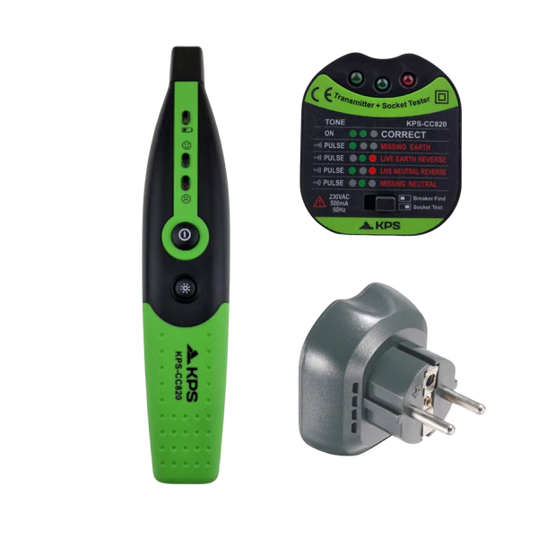 KPS-CC820 es un comprobador de enchufes con función de localizador de protecciones, diseñado para verificar el cableado eléctrico y detectar fallos de conexión o toma de tierra. Permite identificar fácilmente el magnetotérmico o diferencial asociado al circuito, siendo ideal para trabajos de instalación y mantenimiento eléctrico.