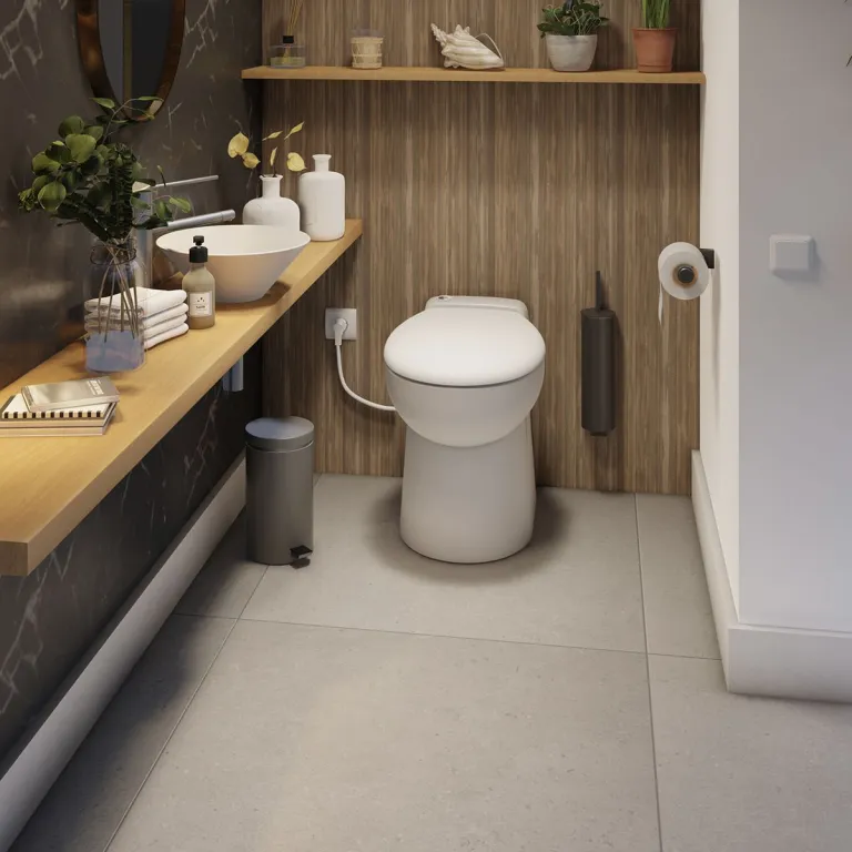 Solo se necesita una toma de agua, un desagüe de pequeño diámetro (ø32 mm) y un enchufe eléctrico. El sistema de trituración integrado permite evacuar las aguas residuales hasta 3 m en vertical y 30 m en horizontal, lo que elimina la necesidad de una bajante cercana.